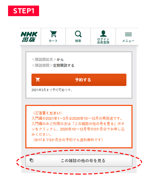 【STEP1】定期購読したいテキストのページへアクセスし(本ページ内に対象誌の定期購読ページへのリンクボタンがあります)、ページ下部の「この雑誌の他の号を見る」ボタンをクリックします。