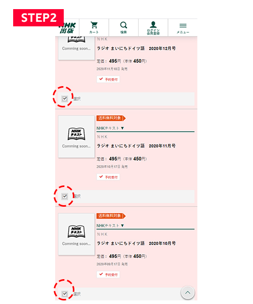 【STEP2】3か月分の予約で送料無料となる「2020年10月~12月」号の背景はピンク色になっています。10月~12月号の「選択」にチェックを入れます。