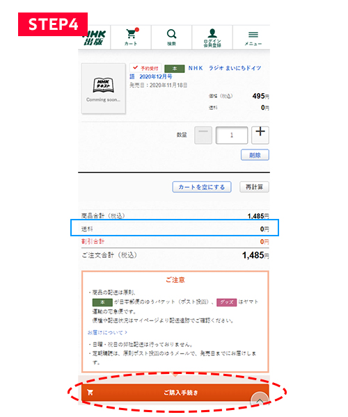 【STEP4】選択した3か月分がカートに入っていることをお確かめの上、「ご購入手続き」ボタンをクリックし、お支払い手続きを進めてください。