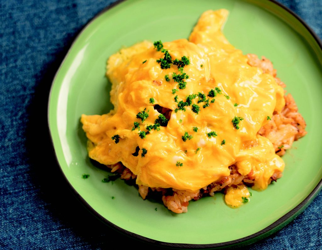 ボロネーゼをごはんに混ぜて、卵を乗せたら、簡単ミートオムライスのできあがり!