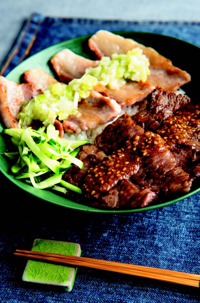 2種の肉(牛肉・豚バラ肉)と2種のたれ(ねぎ塩わさびだれ・スタミナだれ)のぜいたく丼で、肉好き男子&女子も大満足!