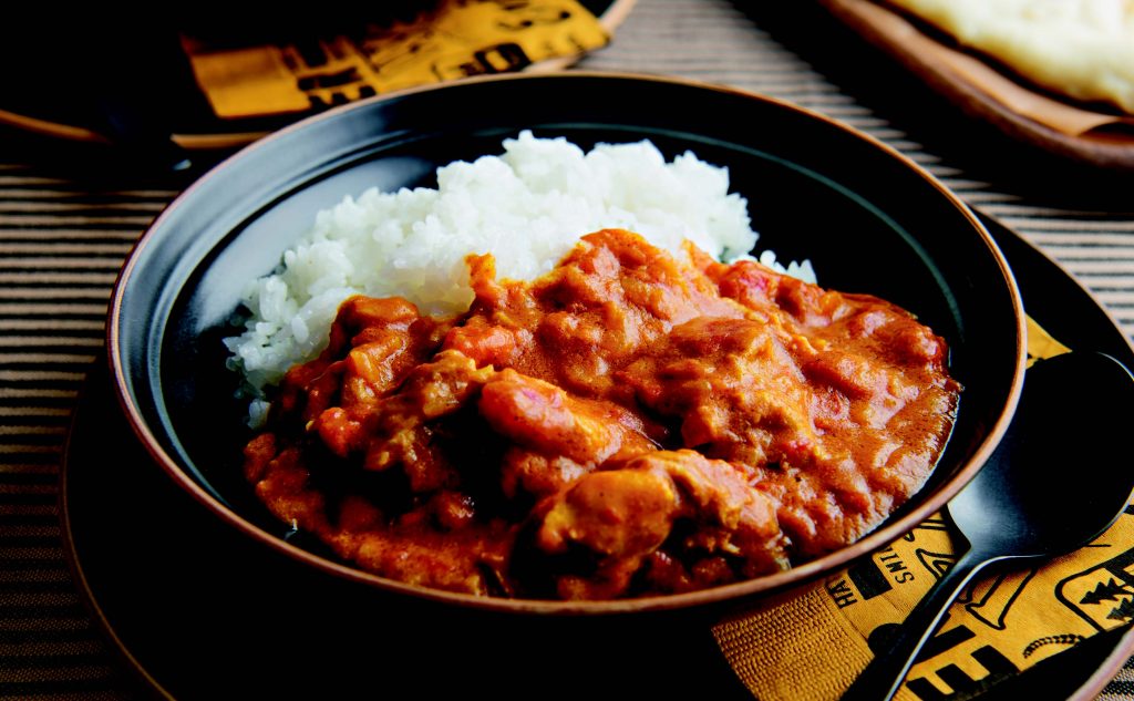 電子レンジだけで、本格的なバターチキンカレーのでき上がり! ゴロゴロ入った鶏肉で孫たちも笑顔に。