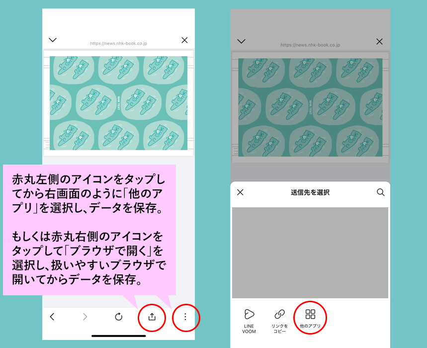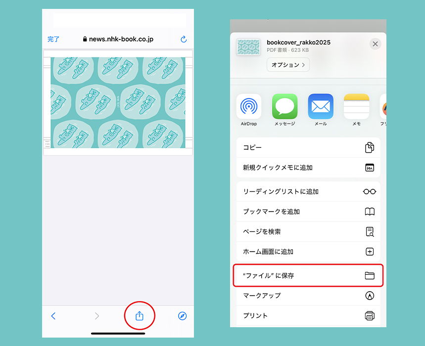 ※ダウンロードボタンを押してデータが表示されましたら、下部のボタンから「ファイルに保存」などを選択して、ご自身のスマートフォンなどに保存してください。