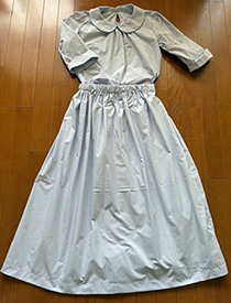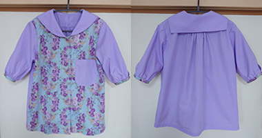 このセットアップが載っている表紙を見て「作りたい!」と思いました。家にあった薄い紫色の布地で作りました。今度は花柄でも作ってみたいです。